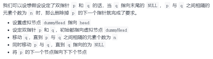 class Solution { public: ListNode* removeNthFromEnd(ListNode* head, int n) { ListNode* dummyHead = new ListNode(0); dummyHead->next = head; ListNode* p = dummyHead; ListNode* q = dummyHead; for( int i = 0 ; i < n + 1 ; i ++ ){ q = q->next; } while(q){ p = p->next; q = q->next; } ListNode* delNode = p->next; p->next = delNode->next; delete delNode; ListNode* retNode = dummyHead->next; delete dummyHead; return retNode; } };