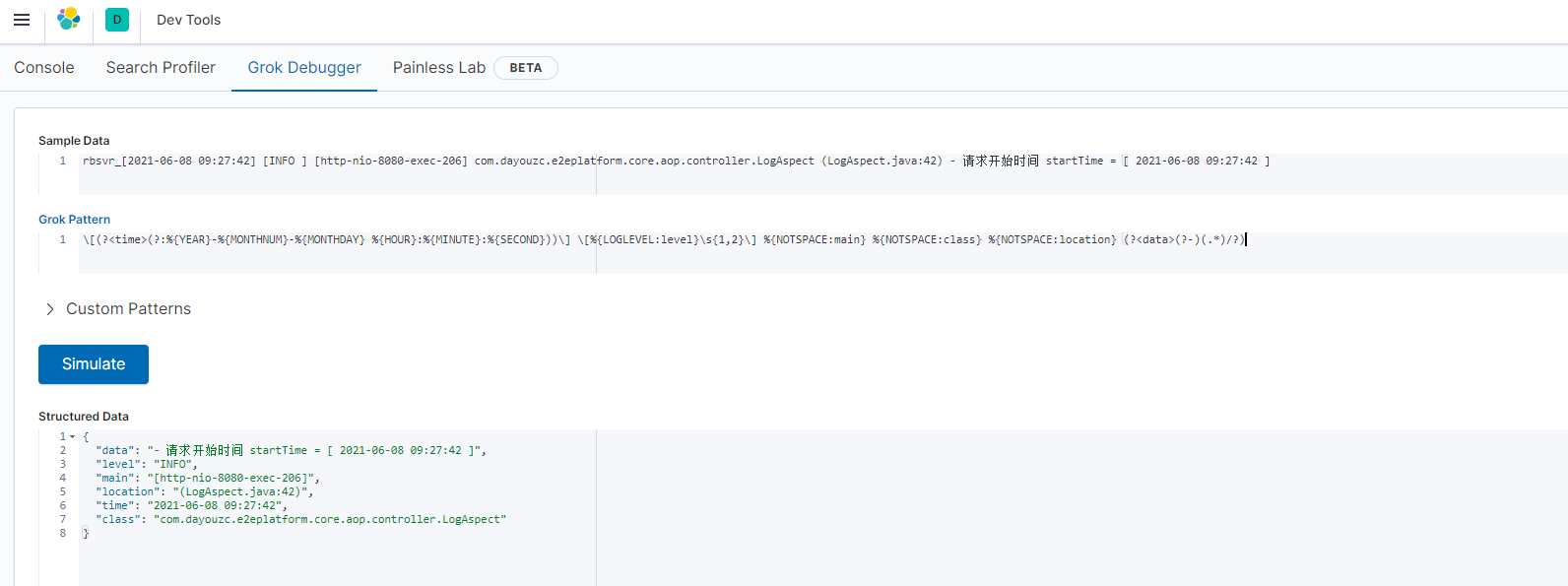 "\\[(?<time>(?:%{YEAR}-%{MONTHNUM}-%{MONTHDAY} %{HOUR}:%{MINUTE}:%{SECOND}))\\] \\[%{LOGLEVEL:level}\\s{1,2}\\] %{NOTSPACE:main} %{NOTSPACE:class} %{NOTSPACE:location} (?<data>(?-)(.*)/?)"