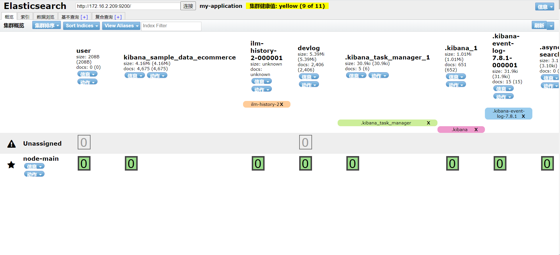 黄色:警告状态,所有主分片目前都可以直接运行,但是至少有一个副本分片是不能正常工作的