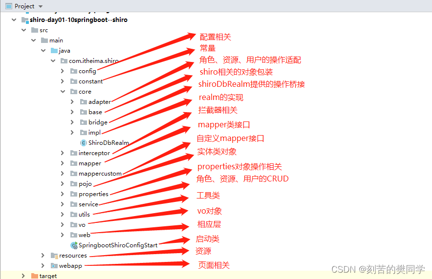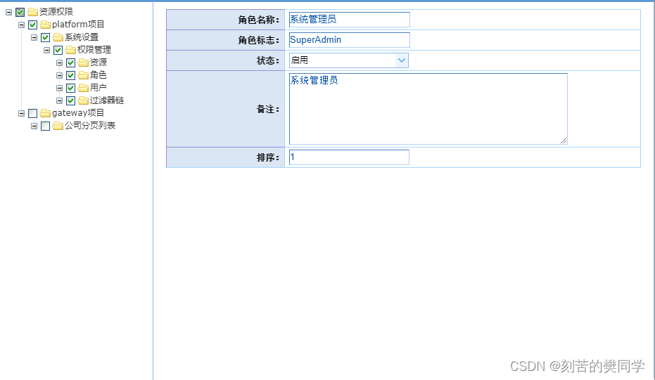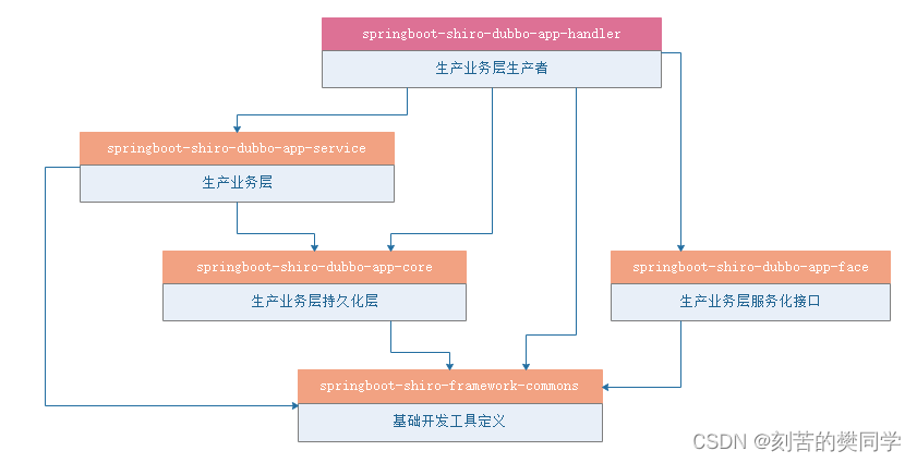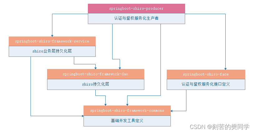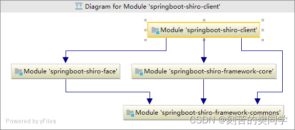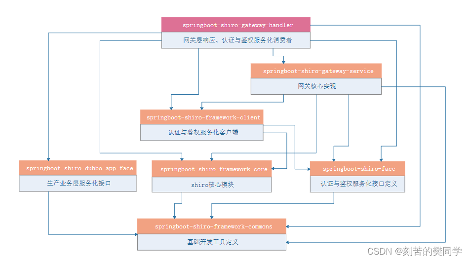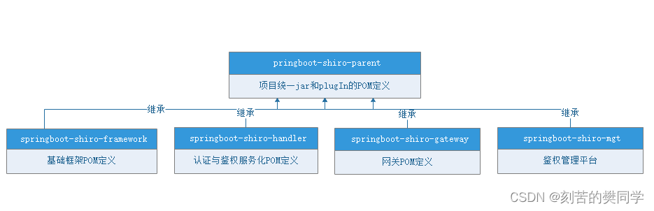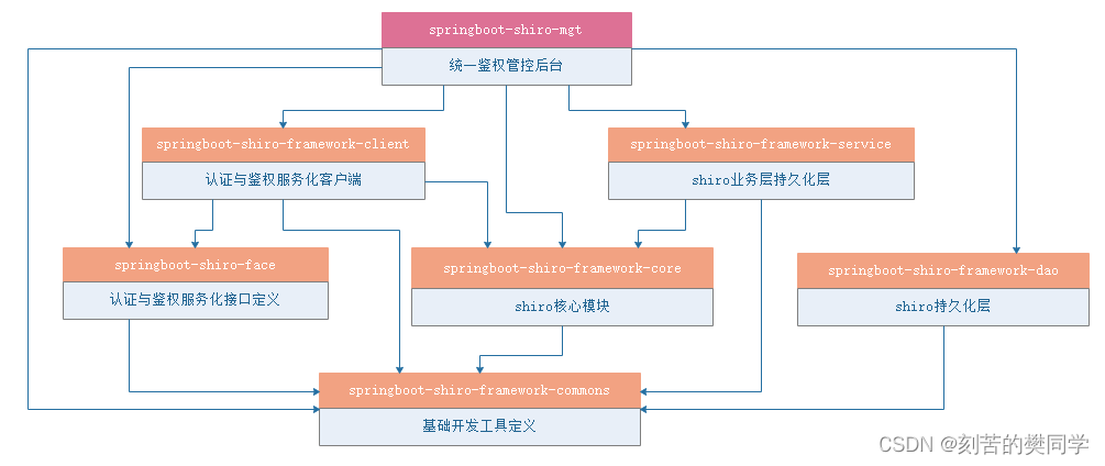 通过上面的模块依赖关系,我们可以看出,shiro-mgt管理平台也是依赖springboot-shiro-framework-client项目实现权限的校验,而他本身主要是负责对角色、资源、用户、过滤器链的CRUD,来实现各个网关平台的权限控制。