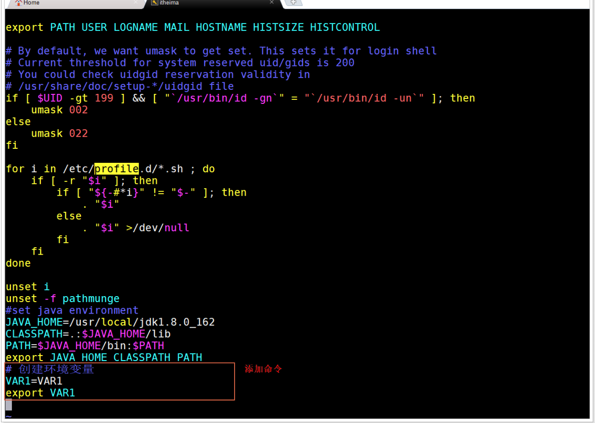 编辑/etc/profile, 增加环境变量VAR1=VAR1