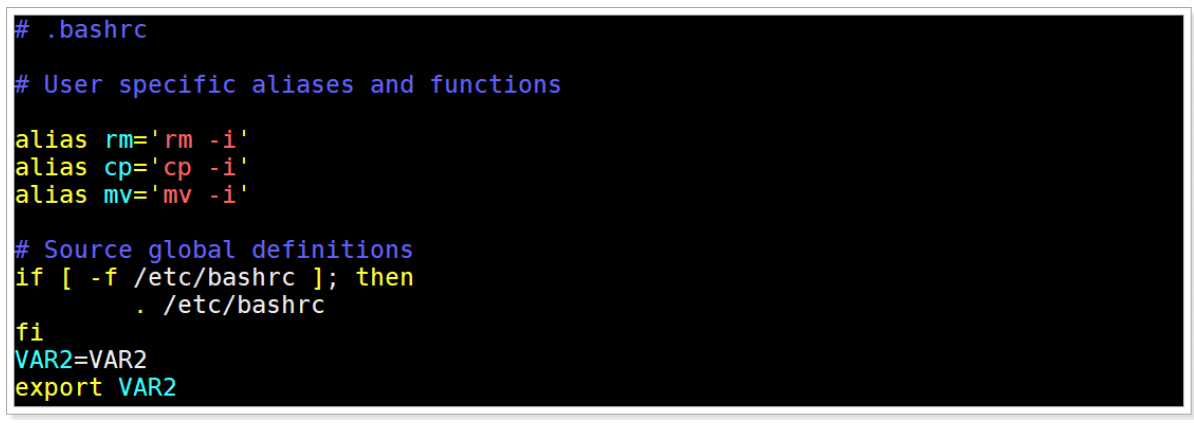 编辑/root/.bashrc, 增加环境变量VAR2=VAR2