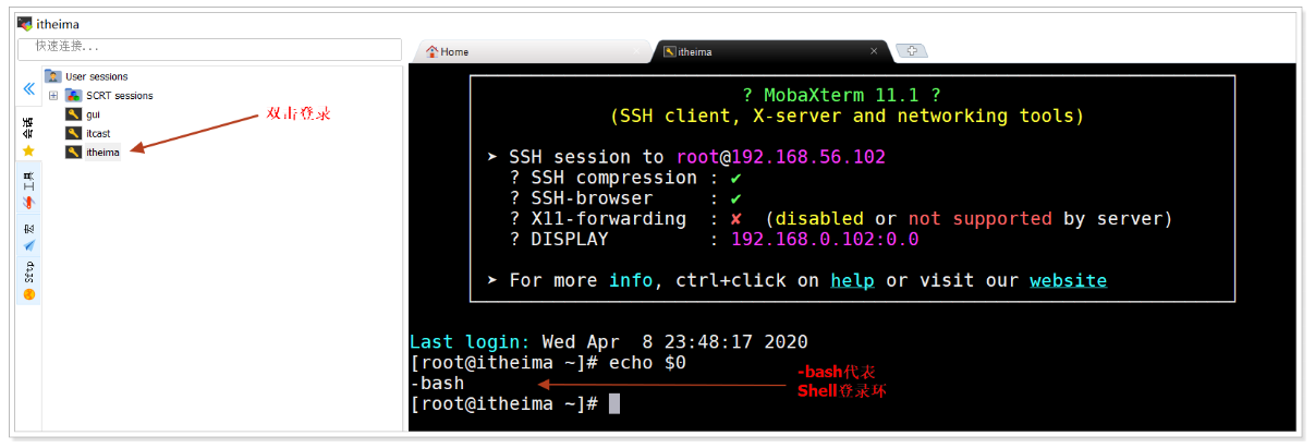 1、直接登录系统为shell登录环境输出 $0 观察输出信息效果