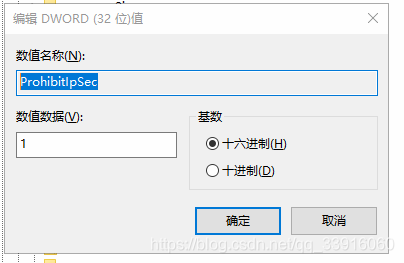 3、新建 DWORD ,在键的位置输入ProhibitIpSec ,并修改其数值数据为1: