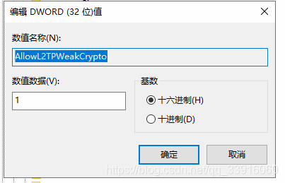 4、修改 键 AllowL2TPWeakCrypto 的 数值数据 为 1 :