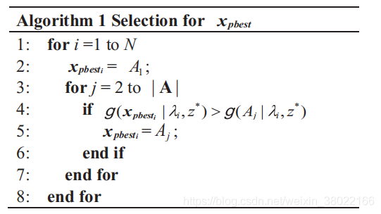 其中t是迭代次数,w是惯性权重,C1和c2是两个学习因子,r1和r2是[0,1]中两个均匀分布的随机数。值得注意的是xpbesti从外部存档 A = { A 1 ,A 2 ,... ,A |A|} 之间的解中选择,,它给出了与权向量λi对应的每个聚集问题的最佳值。下图是选择伪代码: