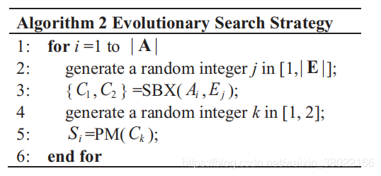SBX算子允许精英解决方案交换有用的基因片段,而PM操作则注入一个小的湍流来搜索局部区域。在外部存档上执行SBX和PM操作符首先从A中选取了一个精英子集E,其中包含了A中具有较大拥挤距离值的一些非支配解。E的大小一般比A小,并且在本文中被设为A的一半。对于每一个解AI(i=1,2,.,x_A_x),在[1,|E|]中生成一个随机整数j。然后,使用Ai和Ej作为执行SBX操作符的父解决方案。SBX操作符中的一个子解决方案是随机选择的,然后进一步执行PM操作符。伪代码如下: