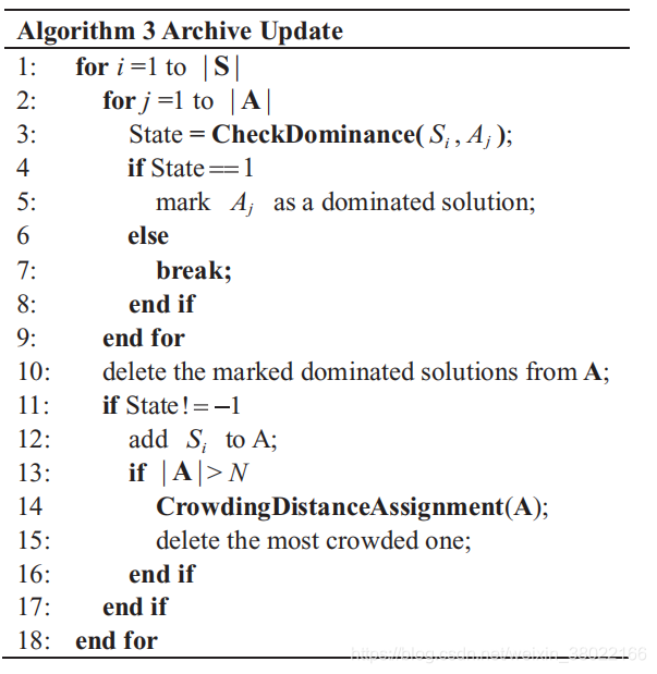 在执行PSO搜索或进化搜索后,将生成的新的非主导解决方案收集到外部存档中。由于存档的大小是有限的,而非支配性解决方案的数量可能是无限的,因此必须使用适当的选择机制进行归档更新,这有助于引导搜索方向走向真正的pf。假设新生成的解决方案集为S,外部存档中的解决方案集为A,则归档更新过程的伪代码如下: