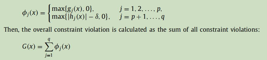 基本上,可行性规则倾向于可行的解决方案,而不是不可行的解决方案。使用此规则,必须对人口中的每个向量计算总体违反约束的程度。为了达到这个目标,违反约束的程度对jth约束的计算如下: