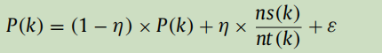 其中,η是学习率,并且总是一个小的正值。ε = 1 × 用于避免可能的0成功率,ns(k)和nt(k)分别表示在第t代候选池中成功的第k个元素的数目和第k个元素的总数。随后,为便于使用,对所有选择概率进行了归一化。