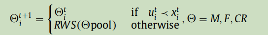 因此,为了平衡搜索引擎的探索和开发能力,同时解决具有不同特征的特定问题,从范围[0.4,1.2]中提取了五个值,并给出了一个步骤。 0.2的步长构成FPool,从范围[0.2,1.0]取5个值,步长为0.2,构成CRPool。请注意,在FBPool中,我们包括一个大的F值(即F=1.2)。 以增加从局部最优逃逸的概率。F>1可以解决一些问题并偶尔有效。