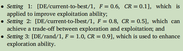 在每一代,每个个体从池中选择自己的突变策略,F和CR。具体而言,每一组精英都选择Setting 1来培育后代,以提高开发利用水平。 各个子群中的弱势群体采用Setting 3来产生具有较高勘探能力的子代。每一组中的平庸者采用Setting 2来产生在勘探和开发之间有权衡行为的后代。