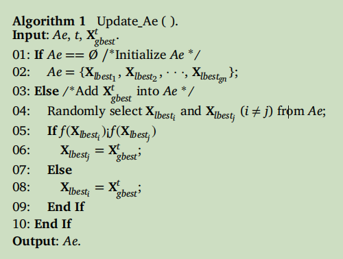 因此,在这项工作中,每一代的精英都被保存在一个档案Ae中。在进化过程的开始阶段(t=1),每一组所有的局部最佳解 (1≤ i≤ gn)的都保存在Ae中。之后,全球最佳解决方案gbest在每一代中(t>1)被添加到Ae中。为了保持Ae的大小不变,个体必须用gbest替换。通常,替换操作符有两种常见的方法。一个是用gbest来代替Ae中最差的个体。该策略的主要缺点是种群多样性可能会迅速丧失。另一种是用gbest替换Ae中随机选择的个体,在这种情况下,Ae中最杰出的个体可能会被替代。因此,在本研究中,采用了一种比赛策略来更新AE。用两个随机挑选的Ae精英中的一个不好的个体被gbest最佳替代。根据上述讨论,Ae的更新过程可以详细描述为算法1。