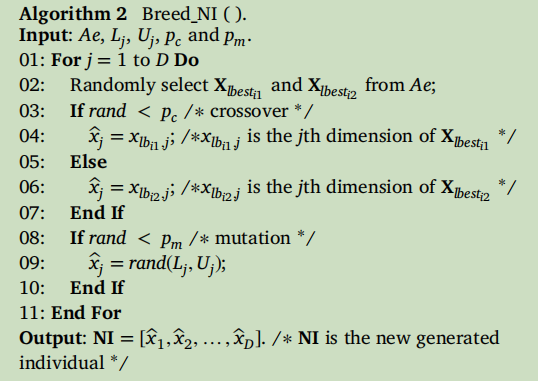 在进行扩大规模的过程中,也必须考虑到一些问题。第一种是何时执行增大的处理。与种群大小递减过程相似,gbest的连续停滞世代数(Sucstag)被认为是种群规模增加的标准。具体地说,就是Sucstag大于预定义的阈值Maxstag。我们认为,当前种群中的个体无法有效地寻找更最佳的解决方案。为了解决这一问题,需要在目前的种群中增加一些业绩优异的新个体。然而,不受限制地向种群中增加新的个体是不可取的。因此,如果种群规模已达到上限,那么目前种群中的许多低等个体应由新的个体取代。第二个问题是如何产生新的个人加入到当前的人口中。请注意,添加的个体数也是gs的倍数。在MRDE中,Ae的所有精英都被用于基于gs算子的新个体的产生,其细节在算法2中给出了详细说明。