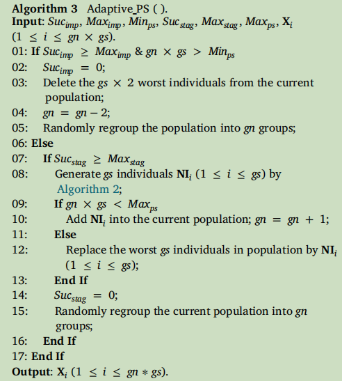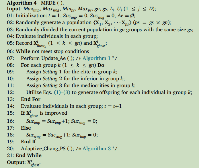 在上述描述的基础上,在算法3中给出了自适应种群大小的伪码。请注意,MRDE中被删除和添加的个体数分别为gn×2和gn。