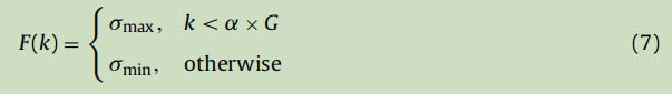 是k代后p-gbest的Dth维扰动操作。从(4)可以看出,p-gbest具有正态分布的特征。σ表示gbest的最优性的不确定性程度。为了说明随着时间的推移所收到的信息,减少了关于最佳位置的不确定性。σ被建模为一个不增加的函数,对于作为方程(7)的迭代次数。为了简单起见,F(k)定义为: