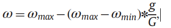 参数控制和自适应一直是粒子群算法研究的热点。惯性因子(权重)ω目的是抑制前一次迭代的惯性速度,从而影响收敛性。工作表明,虽然较大的惯性权重更适合全局搜索,但较小的惯性权重可能会增加局部细化的能力。为了平衡本地和全球搜索能力,以下列方式线性减少ω与迭代次数: