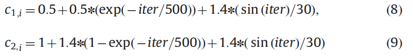 iter表示迭代次数。c1和c2被称为加速度参数,它决定了粒子所能走的最大步长。我们利用控制参数C1和C2的时变特性从而明确地增加和降低了在搜索过程的不同阶段对和