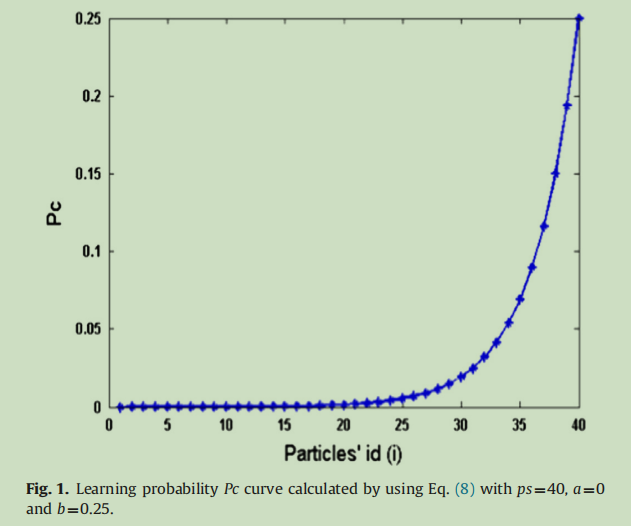 ps表示种群大小。a=0.05,b=0.45,定义了粒子i应该采用哪个粒子的pbest,可以是任何粒子的pbest所对应的维度,由概率Pc决定,也被叫做学习概率。对于粒子i的任何一个维度,都随机生成一个随机数。如果这个数字大于Pc,相应的维度就会从自身的pbest学习。否则,将会从其他的粒子的pbest学习。