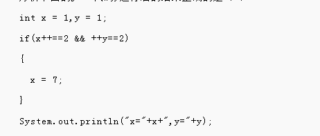 此习题目考察的是if选择结构 和逻辑运算符,在if判断中x++,是先赋值再加加,所以if判断中x++的值是1,1!=2,不满足判断的第一个条件,那么第二个条件就不会再执行,这是&&运算符的一个特性,只要第一个条件不满足,第二个条件就不会执行,所以最后x=2;y=1。