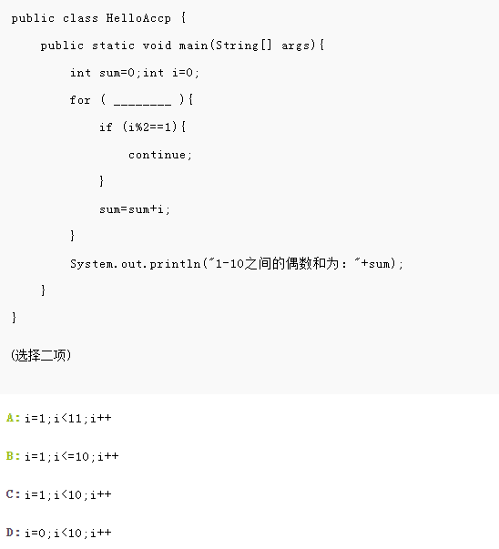 此题考查的是基于for语句的流程控制和continue的用法,continue是结束本次循环开始下一次循环,在if判断中当i为奇数时结束本次循环,所以需要遍历一个区间来获取到所有的1-10之间的偶数,但是由于最终目的是获取一个和,所以可以不用考虑有没有0,因为加不加0,结果不会受影响。所以答案选ab。