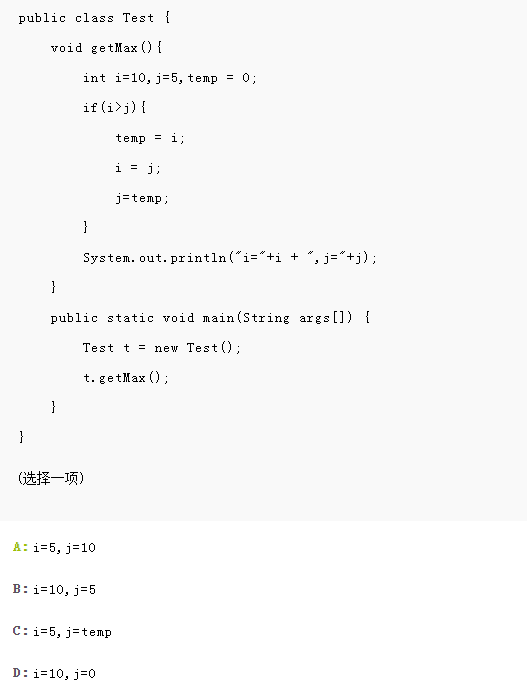 在getMax()函数中,i、j的初始值分别为10、5,(10 > 5),因此会执行下面的语句: temp = i; i = j; j=temp; 上面的语句把i、j的值做了一下交换,因此这时候的值:i=5、j=10,输出的答案为a