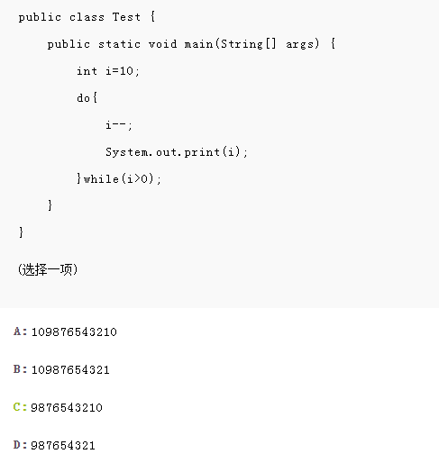 本题考察do-while语句,do-while是先执行循环体后判断控件条件,第一次输出为9,当输出为0时,判断结束循环,所以选择C