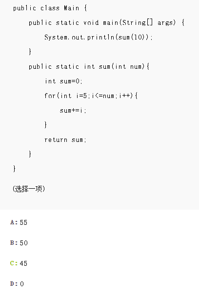 正确答案为C。sum()方法的作用是求出从5到变量num之间所有整数的和,因为调用sum()方法时传递的值num值为10,因此就是计算从5到10之间的整数相加的和,结果为45。