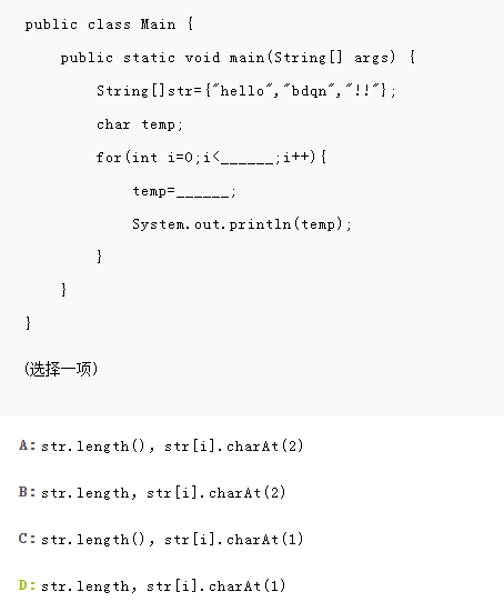 正确答案是D。str为数组,获取数组长度使用length属性;字符串索引从0开始,因此获取第二个字符应该是charAt(1),因此,正确答案是D。