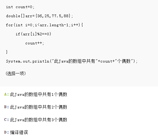 本题考察能够使用一维数组实现数据存储,循环数组由于i<arr.length-1所以是不包含最后一个数88的,只有数组中能被2整除时count会自加1,所以只有36时加了1,结果为1,选择A。如想正确输出偶数个数,要修改代码为i<=arr.length-1或i<arr.length。