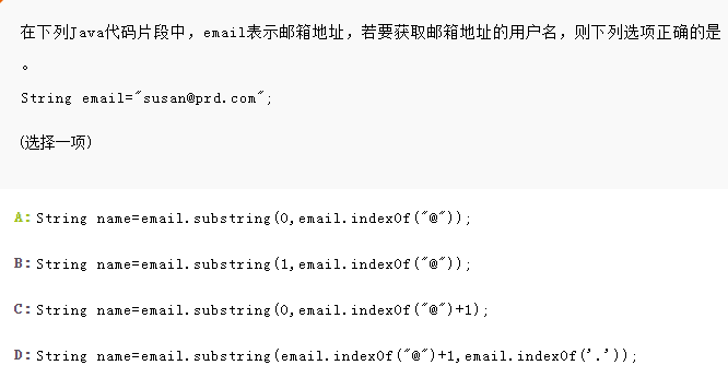 本题考查String类常用方法操纵字符串,public String substring(int beginIndex, int endIndex)第一个int为开始的索引,对应String数字中的开始位置,第二个是截止的索引位置,对应String中的结束位置1、取得的字符串长度为:endIndex - beginIndex;2、从beginIndex开始取,到endIndex结束,从0开始数,其中不包括endIndex位置的字符。indexOf(String str)返回指定字符串在此字符串中第一次出现处的索引,所以选择A