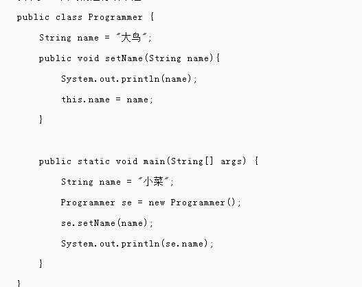 在Programmer类中public void setName(String name){System.out.println(name);this.name = name;}传入的参数name赋值给Programmer成员变量name,在赋值之前会输出传入参数name的值,public static void main(String[] args) {String name = "小菜";Programmer se = new Programmer();se.setName(name);System.out.println(se.name);}在本题中传入的参数的值为:”小菜”,所以会先输出”小菜”,然后输出Programmer的成员变量即为:”小菜”,所以C答案正确