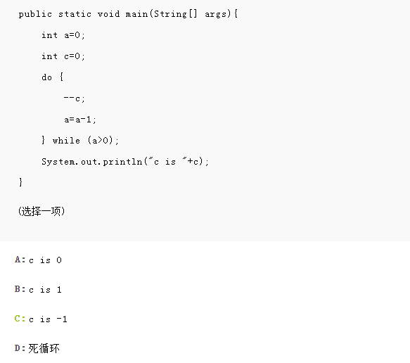 do-while 先执行再判读,这里c=0 进入循环开始 --c 也就是先减 这时候0-1为负值-1. a=a-1 0-1 同上负值 -1 判断并不大于0 直接打印 c is -1