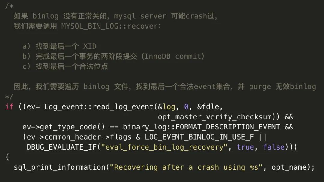 binlog的末尾,会记录一个XID event,标志着事务是否提交成功,也就是说,恢复过程中,binlog最后一个 XID event 之后的内容都应该被 purge。