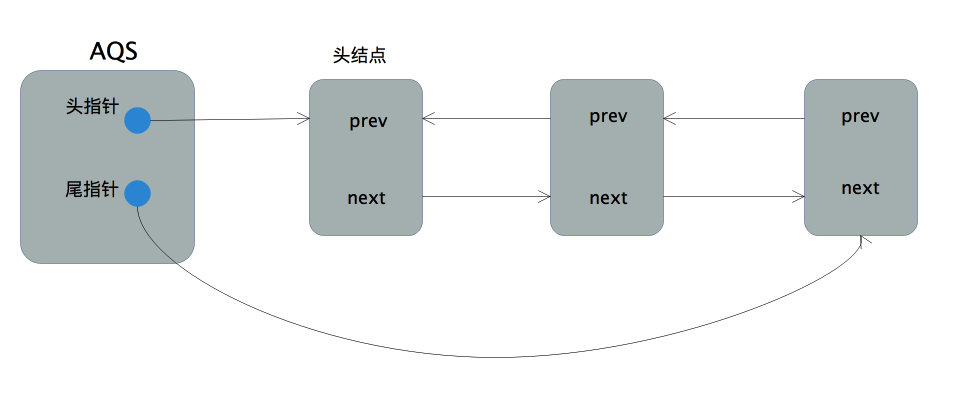 AQS中同步等待队列的实现是一个带头尾指针(这里用指针表示引用是为了后面讲解源码时可以更直观形象,况且引用本身是一种受限的指针)且不带哨兵结点(后文中的头结点表示队列首元素结点,不是指哨兵结点)的双向链表。