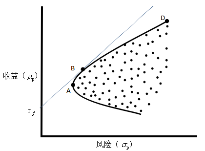 理论上来讲,组合成分间存在无数个混搭方式,每种方式得到一个收益风险对,将所有结果集合在一起,就形成了可行域,如图所示。可行域中并不是所有点都是“好结果”,只有处于可行域上侧边缘的点才是最优值,即MVO的解,如图中A到D之间连线,这条线称为有效前沿。任何异于有效前沿的点,均能找到相同风险(收益)下收益(风险)更高(低)的组合。
