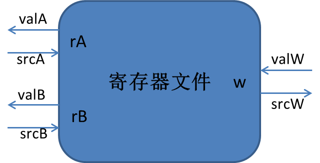 其中寄存器文件有两个读入端口(rA,rB),一个写端口(W)。一个指令中,当数据需要读入到寄存器时,会在srcA或者srcB置一个地址输入,经过一段延迟后,相应程序寄存器的值就会出现在valA或者valB。同理,写入到相应寄存器是同样的过程。这里可以看出为什么指令系统中,指令需要读入的寄存器值的个数可以为两个,而一个指令一次只会写入一个寄存器。