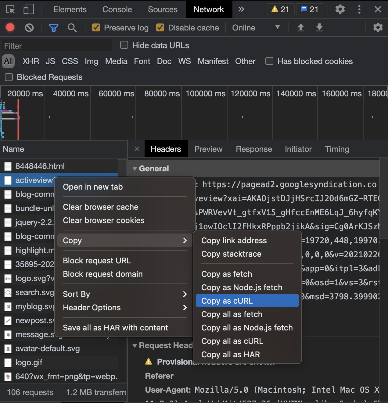 另外,在现代浏览器的开发者工具中,有一个很方便的功能,可以复制所请求的 curl 命令。