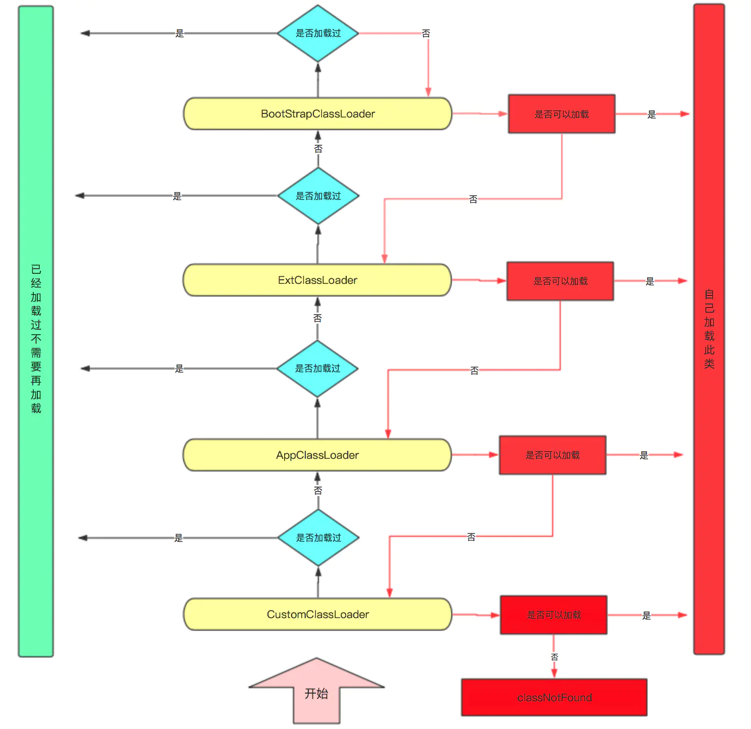 当某个类加载器需要加载某个.class文件时,它首先把这个任务委托给他的上级类加载器,递归这个操作,如果上级的类加载器没有加载,自己才会去加载这个类。