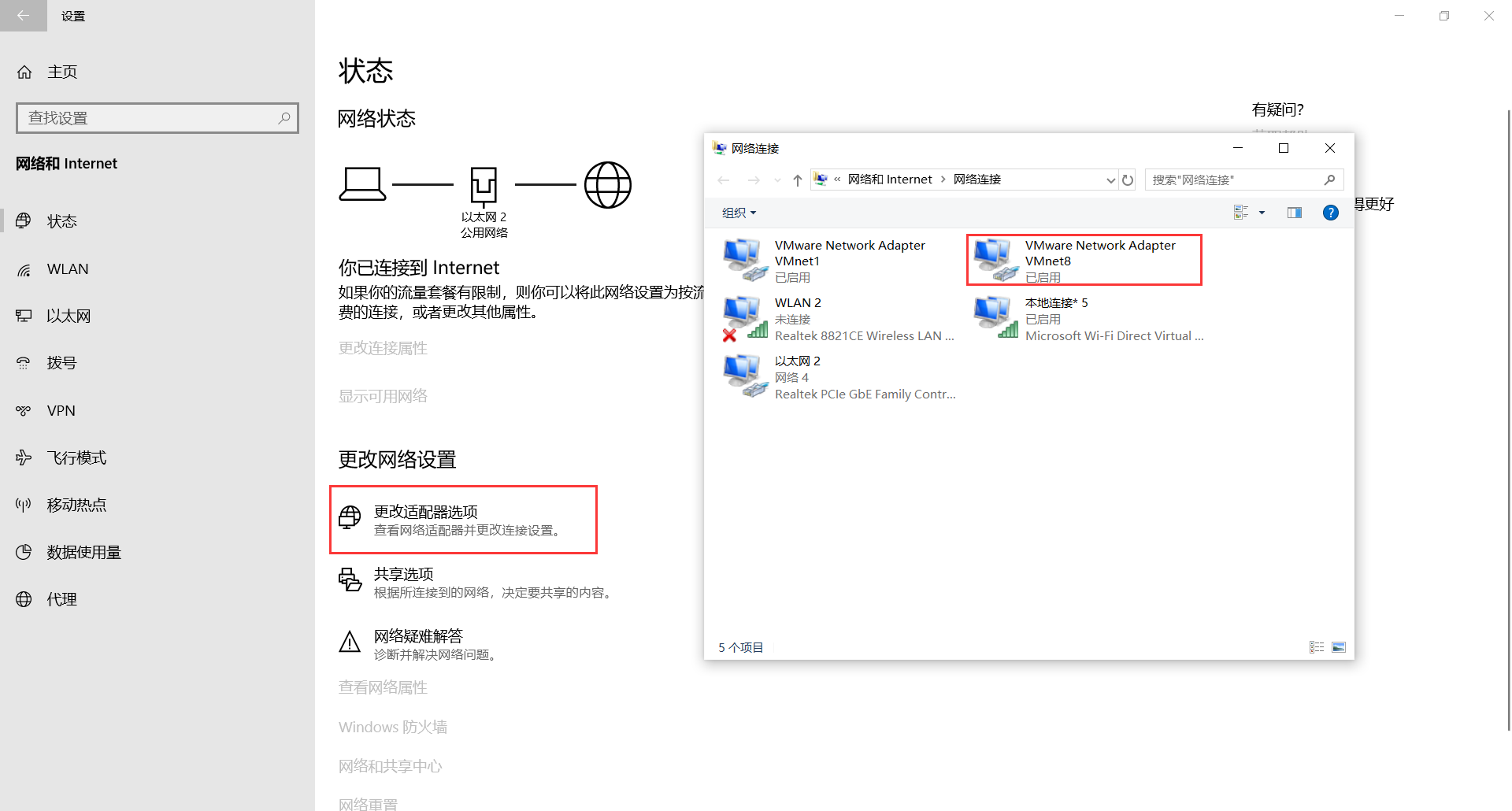 接下来配置网络。打开宿主机设置,网络和internet。然后