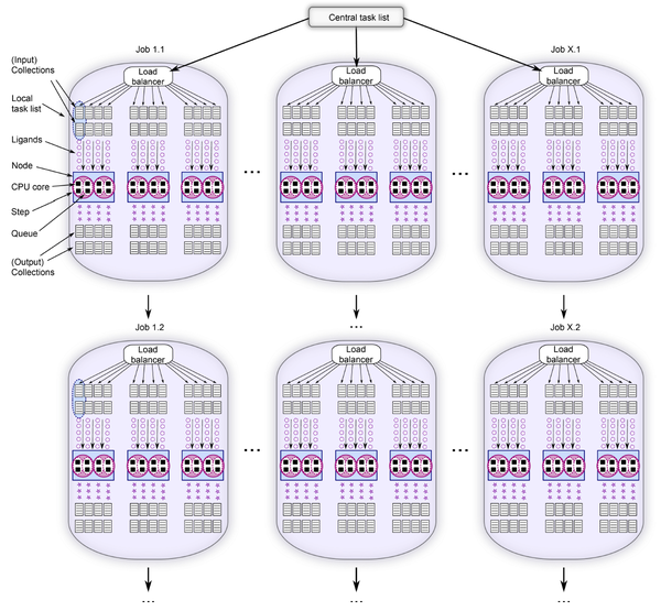 蓝色框表示计算节点,其中包含CPU核数(蓝色框内的黑色正方形),紫色小圆圈代表待处理的配体。整张图代表整个计算集群,并行运行1.1到X.1个任务,任务1.1完成后会自动运行任务1.2,以此类推直到任务完成。