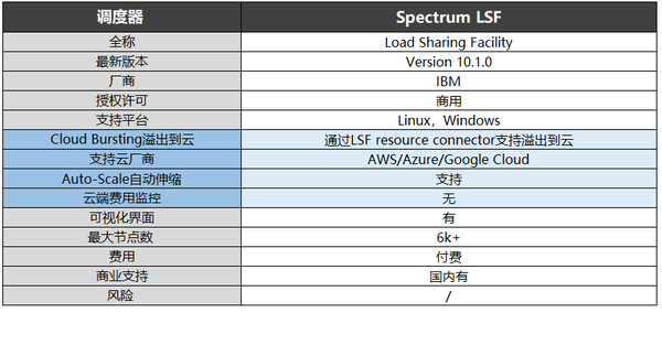在这三个调度器中,仅有Spectrum LSF支持Auto-Scale集群自动伸缩功能,同时该调度器还可通过LSF resourceconnector实现溢出到云,支持云厂商包括AWS、Azure、Google Cloud。