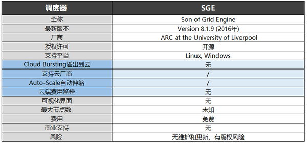于是,Grid Engine社区开始开源版本的SGE(Son of Grid Engine)项目。该调度器最后一次更新为2016年的8.1.9,由于存在版权风险,SGE已长期无维护和更新。