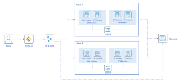 fastone平台可综合考量用户对完成任务所需时间和成本的具体要求,在多个云厂商的资源之间选择最适配的组合方案,为用户跨地区、跨云厂商调度所需资源。