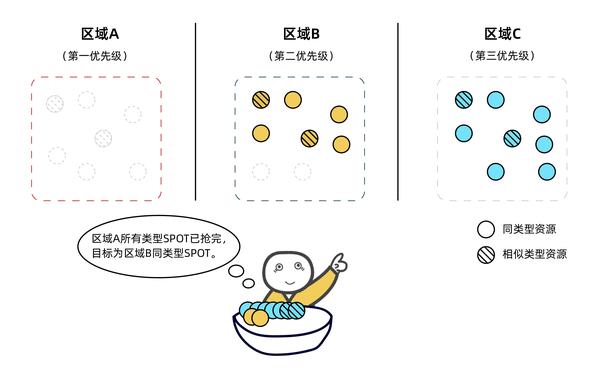 下图场景是出于成本优化目的,我们为用户自动调度本区域及其他区域的目标类型或相似类型SPOT实例资源。