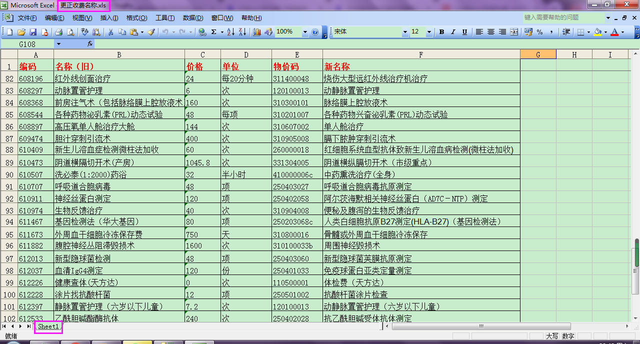 这个Excel数据源的文件名叫【更正收费名称】,工作表的名字叫做【Sheet1】,我们知道文件名和工作表的名字,在Excel中均可以更改。