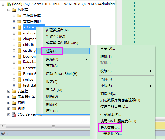 2.右键单击数据库a_ExcelToSql,依次选择【任务】、【导入数据】
