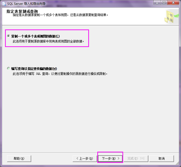 6.弹出下图所示对话框,选择【复制一个或多个表或视图的数据】,点击【下一步】。