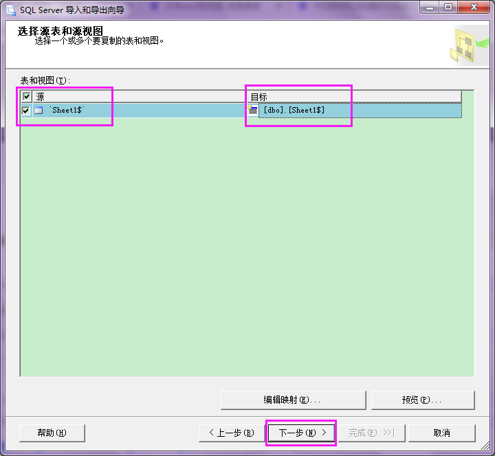 【目标】下面的【dbo.[Sheet1$]】就是数据导入SQL后的表名。