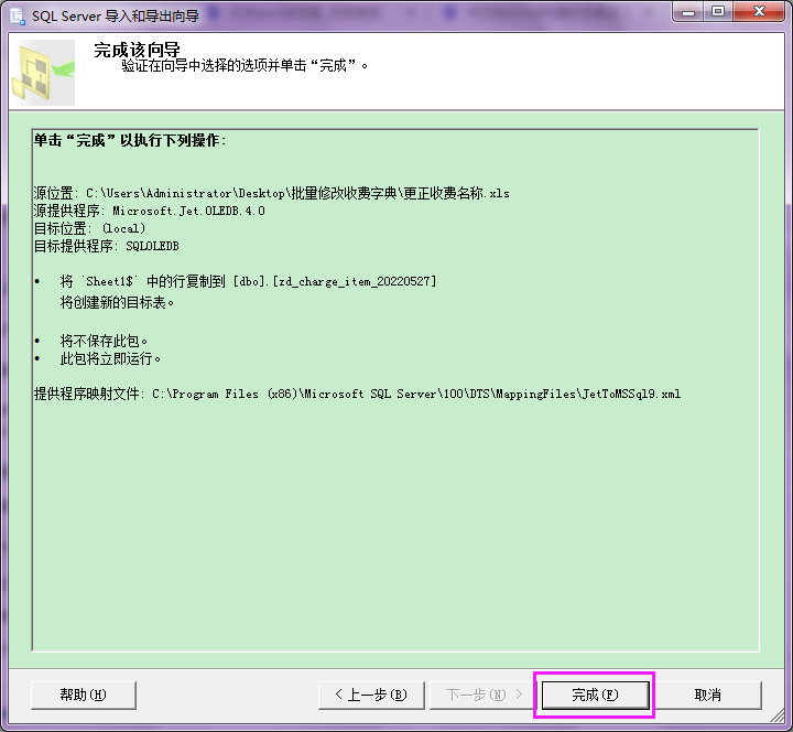 可以直接将【目标】下面的 [dbo].[Sheet1$] 替换为zd_charge_item_20220527,